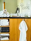 Badrumsskåpet är fyllt med handdukar från det egna varumärket.