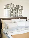 Master bedroom är Kristinas favoritrum, och sängen är en uppvisning i bäddtextilier och mjuka kuddar. All inredning kommer från Lexington, inklusive sängen.