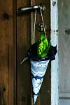 6. Stick två små hål med en vass nål/syl i övre kanten av struten. Knyt fast ett upphängningssnöre i struten. Klart!