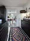 7. Att välja färger som går ton i ton är ett säkert men lite tråkigt kort. Satsa på komplementfärger i stället. Som här med en kelimmatta som ger färg i kontrast. Bara fantasin sätter gränser! Mellan köket och matsalen går en gång med kylskåp och förvaring. Köksöns ena sida utgörs av en stor griffeltavla med plats för familjens veckoplanering.