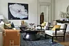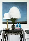 Tittgodis upphöjt till blåsvart. Under molntavlan av Ove Pihl är det antika svarta bordet prytt med en bordslampa med förgylld fot, kinesiska tempelhundar från Antikmässan och en sydafrikansk korgkruka med snäckor.