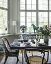 Matsalens burspråk är fritt från gardiner. Kring matbordet står klassiska Thonetstolar ihop med traditionella Göteborgsstolar som passar fint ihop i form. De gråtonade snickerierna är väl synliga mot stockholmsvita väggfält. På den vackra fiskbensparketten ligger en grå matta från Fogelmarks.