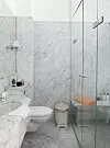 Badrummet är ett direkt spa med Carrarramarmor på golv och väggar. Innanför glasväggen finns ångbastu och väggfasta marmorbänkar, allt inspirerat av antikens badhus i Rom.