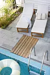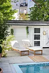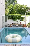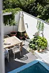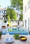 Att en Medelhavsidyll gömmer sig bakom det klassiska 1900-talshuset mitt i stan är svårt att gissa. Men att komma in på bakgården är som att kliva ut rakt i ett lummigt semesterparadis med ett poolområde som hämtat från Franska rivieran.