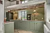 Köket är en riktig fullträff, infällda luckor i grönmålad pärlspont å ena sidan och helt moderna skåpsmoduler å andra sidan, men samma gröna färg är genomgående.