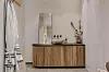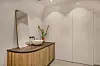 Ett badrum med klass, skåpsmodul i trä med ett tvättställ i marmor, svarta tvättställsblandare och väggar målade i en nude-kulör.