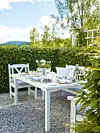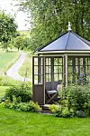 Sittplats på södra sidan av huset. Det ger en härlig känsla att sitta omgiven av gröna väggar, som ger både lä och privatliv, och samtidigt njuta av blomsterprakten och de härliga dofterna.