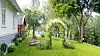 Runt lusthuset perenner som blommar vid olika tidpunkter under hela sommaren planterade. Lusthuset är från ida-ide.no och monterades på plats.