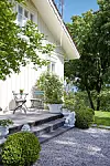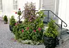 Utanför ytterdörren växer  'Rose de Rescht' samt vit och blå klematis. Lagerträd står planterade i krukor och svarta betongurnor. Den uppstammade rosen i bakkanten heter 'Look Good Feel Better'.
