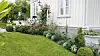 Längs stigen mot sittplatsen växer en rad mattbildande perenner som blåflox och lammöron, tillsammans med revsuga, vinterglans och jättedaggkåpa.