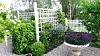 Staketet ut mot vägen och spaljén som bildar väggarna runt matplatsen skapar ett spännande samspel. Första åren växte 'Constance Spry'-rosor här, men de har ersatts av klematis.