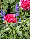 Rosorna mot söderväggen är 'Constance Spry' från David Austin. Den har stora ljusröda blommor med stark doft och blommar en gång varje sommar. Buskrosen 'Tuscany Superb' har planterats runt omkring.