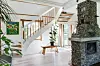 Ljus och öppen hall med öppen spis mot vardagsrummet. Foto: SE360