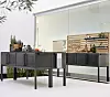 7. Utekök "Verner" i grå aluminium och med dörr i textilene. Bänk med diskho och kran, l 120 cm, dj 60 cm, total höjd 143 cm, 4 495 kr. Avlastningsbänk, l 120 cm, dj 60 cm, total höjd 143 cm, 3 295 kr. Från Mio.