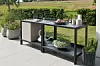 8. Utekök "Sensum Ekeby", med stativ för inbyggnadsgrill. Stomme i pulverlackerat stål och med toppskiva i stål, fibercement eller teak. H 80 cm, l 180 cm (210 cm inkl handtag), br inkl hjul 69 cm, 6 679 kr, Bauhaus.