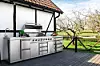 5. Svensktillverkat utekök "Hälsing 1 800 Legacy Kitchen", i pulverlackerat rostfritt stål och med bänkskiva i borstat rottfritt stål. L 186 cm, dj 63,5 cm, h 91,5 cm (med kran 141,5 cm), 30 900 kr, Hälsing.