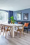 Låt både textilier, detaljer och väggar gå i samma färg. I den här matsalen har väggarna målats i kulören ”Skuggblå” (4629) från Jotun. Foto Filippa Tredal