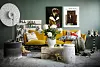 Lampa ”Filigree Floor Lamp”, h 240 cm, diam 80 cm, ca 19 150 kr. Puff med frans ”Amami Pouf”, h 40 cm, diam 50 cm, 12 030 kr, vas med guldägg ”Delft Blue No. 06”, 32,5x36 cm, ca 8 950 kr, guldfigur på golv ”One Minute Sculpture”, ca 15 000 kr, sidobord ”Chess Table”, h 60 cm, dj 40 cm, br 40 cm, 9 045 kr. Kuddar med mönster i soffa ”Oil/Heritage”, 40x60 cm, ca 7 700 kr för 3 st, allt från Moooi. Schackpjäser, tillhör Moooi, dekoration av Martine de Schipper/martinedeschipper.nl. Skulpterad fot i lera, pris på förfrågan, Ina M Andersson/Studio Osprey/@osprey_sweden. Liggande piedestal ”Solid Square Log”, h 50–60 cm, djup 20 cm, längd 30 cm, 4 950 kr, Dry Studios. Pall i emaljerad metall ”Last Stool”, h 44 cm, diam 32 cm, ca 3 660 kr, Hem. Kaffekopp med fat ”Paper Porcelain”, h 7 cm, 289 kr, Hay. Sammetssoffa, h 70,5 cm, längd 213 cm, sitthöjd, 41 cm, 41 250 kr, Magis. Randig kudde ”Azabu White”, 40x60 cm, 895 kr, Mimou. Pläd ”Lucy”, 130x150 cm, 299 kr, Mio. Oljemålning ”All Will Be Thrown Out After The Show”, Thomas Elovsson, pris vid förfrågan, tillhör Dusty Deco. Fotografi med kvinna i gasmask ”Gas Me Numb”, 60x80 cm, 15 065 kr, Ali Kepenek, fotografi med gul fågel ”Bird #44 Rio de Janeiro”, 60x80 cm, 3 800 kr, Erik Berglin, båda från absolutart.com. Matta ”London”, 200x300 cm, 4 999 kr, Ellos. Väggfärg ”734 Blåstång”, Alcro.