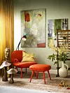 Stol ”Pina Lowchair”, h 80 cm, br 78 cm, sitthöjd 48 cm, 17 500 kr, fotpall ”Pina Footstool”, h 45 cm, br 67 cm, 7 875 kr, båda från Magis. Handvävd kudde i siden och lin, 50x50 cm, 895 kr, Mimou. Handgjorda svampar i trä ”Wooden Mushrooms”, h 40 cm, 1 800 kr, h 52 cm, 3 500 kr, Perspective Studio. Skulpterat huvud i gips, pris vid förfrågan, Ina M Andersson/Studio Osprey/@osprey_sweden. Mässingspall ”Last Stool”, h 44 cm, diam 32 cm, ca 5 230 kr, lampa ”Alphabeta Floor Lamp”, h 158 cm, 9 000 kr, båda från Hem. Höganäsvas i keramik, h 52 cm, 12 500 kr, Dusty Deco. Träram med kulor, tillhör Moooi, dekoration av Martine de Schipper/martinedeschipper.nl. Stor oljemålning, 100x140 cm, 22 000 kr, Maria Tolstoy Sinclair/tolstoysinclair.se. Liten oljemålning ”Monza”, 100x70 cm, 699 kr, Mio. Ullmatta ”Amarillo”, 200x300 cm, 6 999 kr, veckbandslängd i sammet ”Elvira”, br 125 cm, längd 300 cm, 1 899 kr/2 st, båda från Ellos. Väggfärg ”710 Fjärdlång”, Alcro. Träklossar på golv, privat. Tack till Gunnels Blommor.