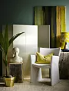 Det är en trend just nu att ta in olika objekt i inredningen, och gärna sätta dem på en piedestal. En vikvägg är också ett fint inslag i rummet.