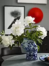 Vas ”Blow Away Vase”, 30,5x26 cm, 9 930 kr, fat ”Delft Blue Plate”, diam 35 cm, 3 500 kr, båda från Moooi. Fotoprint ”Stockholm 98 #1”, 50x70 cm, 950 kr, Dry Studios. Röd väggskulptur i tyg på trä ”Happy Pills”, h 40 cm, dj 12 cm, br 40 cm, pris vid förfrågan, Edoardo Modenese/edomodeney.com. Matbord ”Brisbane”, h 75 cm, diam 110 cm, 2 999 kr. Stol ”Benita”, h 78 cm, br 56 cm, sitthöjd 44 cm, 2 499 kr. Byrå ”Barny”, h 110 cm, br 50 cm, 1 799 kr, alla tre från Ellos.