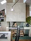 En öppen spis är nästan ett måste i en vindsvåning. Här i en snygg enkel modell där kåpan har putsats i en ljusgrå nyans.