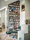Bokhyllorna är platsbyggda av Claes. De täcker hela väggen och följer takets fall. Stegen, som är en förutsättning för att nå böckerna högst upp, sitter i en skena och är flyttbar.