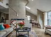 I vardagsrumsdelen dominerar den grå putsfärgen. Trenden i dag är att skulptera murstockarna mer distinkt och rakt än tidigare. Det finns inte så många ytor att hänga konst på i en vindsvåning, däremot finns idealiska nischer och prång för inredningsobjekt och skulpturer. Triplexlampan är en effektiv belysningsarmatur som når långt ut i rummet. Kuddar från Oscar & Clothilde