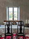 Matsalen som ligger invid köket har matsalsmöbler i klassisk stil – stolar från 1700-talet och matbord från 1800-talets senare hälft.