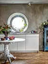 Köket är platsbyggt med bänkskiva i rostfritt. Nyansen på skåpdörrarna är densamma som dörrarna i resten av våningen – en mjuk pastellgrön variant. Det runda fönstret var ett förslag av arkitekten så att den som diskar skulle kunna vila ögonen på en vacker utsikt under arbetet.