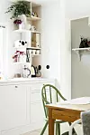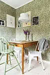 Kökets matplats är perfekt för den lilla familjen. Det gamla furubordet kommer från en släktgård, stolar från Tolix och taklampa ”Bumling” från Atelje Lyktan. Tapet ”Willow Bough”, William Morris.