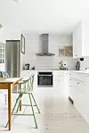 Kaklet i köket är ett standardkakel 15x15 cm, satt i halvförband. Det vackra furugolvet är behandlat med vitpigmenterad hårdvaxolja.