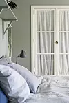 Sovrummet är målat med den milda grågröna nyansen ”Tant Johannas gröna” från Nordsjö. Sängkläder, Mimou, bordslampa från butiken Esq i Linköping.