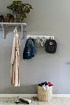 Hallen välkomnar med vilsamt grå väggar, målade i en nyans som hittades i klinker­plattorna ”Ninni” från Marrakech Design. De tog med plattorna till färgbutiken som tog fram en nyans som går ton i ton med mönstret. Hatthyllan är ett hemmabygge som målats i samma färg som väggen.