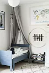 Sängen i barnrummet är ett Blocketfynd som målats om i en blå nyans. Sänghimlen är hemmagjord genom att man satt upp en rundstav i taket och hängt ett linnetyg över den. Katt-tavla, Myrorna, världskarta, Desenio.