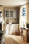 Rullgardinerna i 1700-talsstil är egentillverkade med material från Gysinge Byggnadsvård och tyg från Stoff & Stil. Ljuskronan kommer från en antikhandel i Frankrike. Matta från Kasthall, köksbordet och kökssoffan är köpta i en antikhandel, köksstolarna är Leksandsstolar. Kuddar från Ceannis och Chamois, vasen är arvegods.