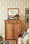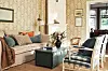 Tapeten ”Pineapple frond” i vardagsrummet är handtryckt och kommer från brittiska Soane. Den rymliga soffan från Artwood fungerar också som extrasäng när det kommer gäster. Gripsholmsstolarna är klädda i tyg från Romo, brudkistan är ett loppisfynd.