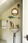 Badrummet är inrett i en uppdaterad sekelskiftesstil. Spegeln med metallram kommer från Fartygsmagasinet i Gamla Stan – en guldgruva för den som vill få in marina inslag i inredningen