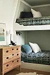 Våningsängarna är platsbyggda. ”Vi kallar detta rum kajutan eftersom det är lite båtkänsla när man ligger uppkrupen i sängen”, säger Eva. Överkast, Blue Window.