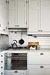 Köksskåpen har spegeldörrar och tidstypiska handtag, och det fasade vita kökskaklet är satt i halvförband. Den moderna ångugnen och gasspisen från Smeg passar bra ihop med kökets sekelskifteskänsla.