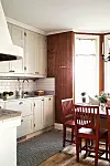 Köket ritade Eva tillsammans med Annette Biörk på Traditionella Lantkök i Gustavsberg. Eftersom köket är så litet var det en utmaning att få till bra arbetsytor.