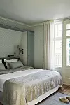 I det ljusa sovrummet finns en dörr, komplett med speglar och spröjs, ut mot hamnen. Sängkläder från Chamois, linnepläd, Himla, matta, Blue Window, tofflor från Ceannis.