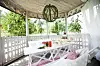 Målade möbler är snyggt på verandan. Observera ljuskronan ovan bordet som förutom hållare för stearinljus även har plats för små krukor. Det blir effektfullt när det gröna i dem börjar växa och hänga ner. Foto Lina Stiling/Getty Images.