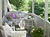 Veranda i gammaldags stil. Pelargoner, pioner och textilier med rosa rosor samt vita rottningmöbler – mer romantiskt än så här kan det inte bli. Foto Per Magnus Persson/Getty Images.