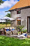Dynorna i loungestolarna är klädda med linnetyget ”Brera Moda”, rostfärgad kudde klädd med tyget ”Fortezza”, båda från Designers Guild. Mörkblå kudde i tyget ”Fiorita”, William Yeoward/Designers Guild. Solhatt, 249 kr, Kapp Ahl. Solglasögon, 265 kr, Izipizi.