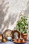 Kanna i mässing, 499 kr, Soulosofie. Underlägg, 248 kr, Lindform. Litet träfat, 195 kr, större flätat fat ”Zimi”, 265 kr, större träfat, 250 kr, allt från Malaika Cotton. Stänkmönstrad keramikvas ”Bari”, 440 kr, Lindform. Träskål på fot, 865 kr/3 pack, Malaika Cotton. Skulptur ”Eve”, h 25 cm, 895 kr, Cooee.se. Träbricka, 745 kr, Bruka Design. Lattemugg ”Morgon grå” i keramik, 313 kr/st, Paradisverkstaden.