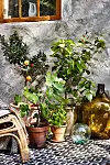 Mindre träfat, 195 kr, Malaika Cotton, träfat med fötter, 495 kr, Soulosofie. Liten keramikskål, 79 kr, Bitz. Liten svart spilkum, 150 kr, vinrött kakfat, 275 kr, båda från Pottery Jo. Stol, privat. Karaff i keramik, 725 kr, Fide Fajans. Kruka med handtag, privat. Glaskaraff ”Raami”, 1 liter, 999 kr, Iittala. Keramikvas ”Ebba”, 420 kr, Lindform. Sittdyna ”Boho”, 40 x 40 cm, Jotex. Ljusslinga ”Flexi out/Sari”, 1 999 kr, PR Home. Metallsoffa, privat