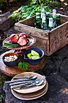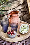 Rund bricka i palmträ, 750 kr, Malaika Cotton. Tillbringare i keramik, 525 kr, Fide Fajans. Dricksglas ”Kastehelmi”, 30 cl, 238 kr/2-pack, Iittala. Liten keramikskål, 79 kr, Bitz. Keramikfat ”Bananblad”, 180 kr, Mimou.