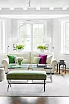 Vardagsrum med soffa från Green Apple. Den gröna puffen har Liv själv ritat och låtit ett möbelsnickeri tillverka.