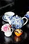 Kannan och kopparna i blått och vitt med gulddetaljer inköptes på en resa i Sankt Petersburg.